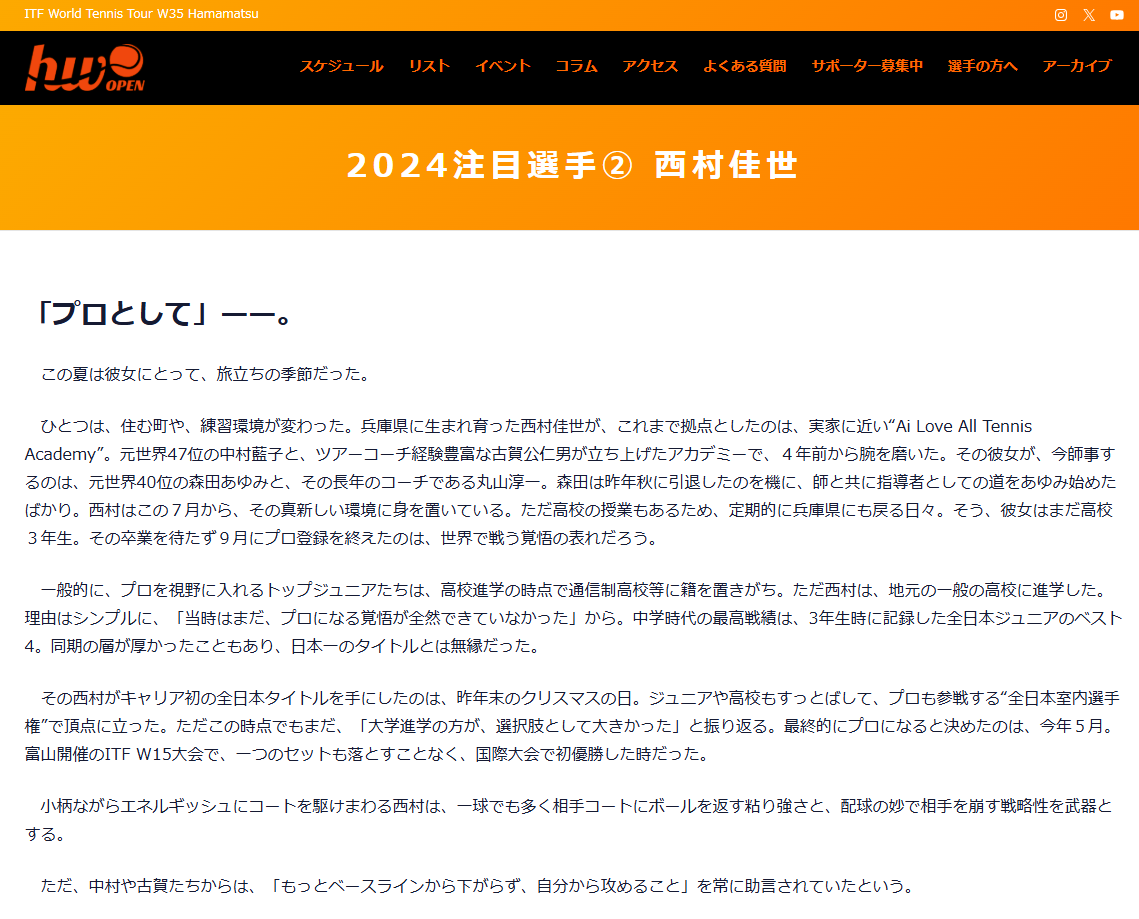 親に文武両道がテニスをする条件と言われ、普通校に通いながら精一杯努力をし、テニスを楽しんできた西村佳世選手。