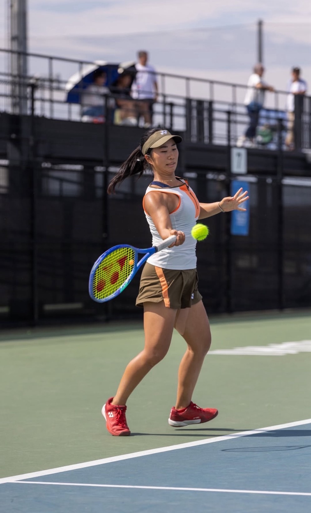 試合は、Monteleone選手のサービスゲームからのスタートでした。サーブは抑えているのかイン率は高いですがスピードは遅めでした。自分で打ちにいかないといけない反面、男子並みの速くて強烈なサーバーに悩まされたことも多いので、私にとってはラッキーでした。
